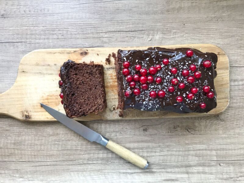 Czekoladowa babka z majonezem? Dobrze czytasz. Ciasto z kakao, majonezem Kieleckim, polewą czekoladową i czerwoną porzeczką.