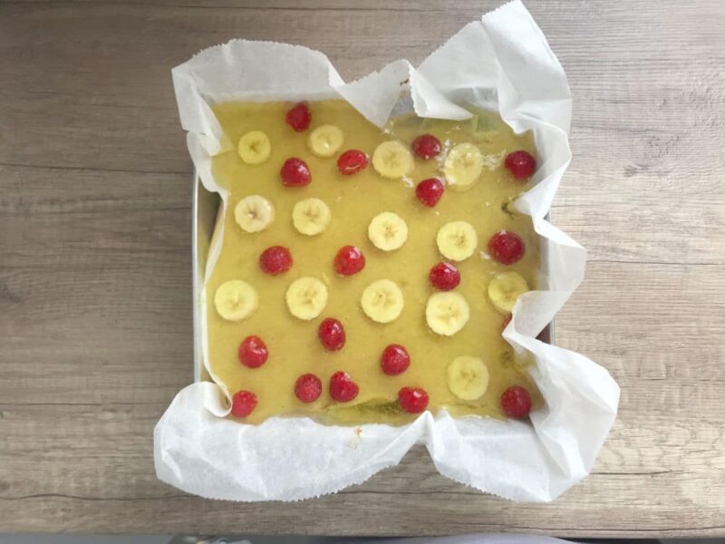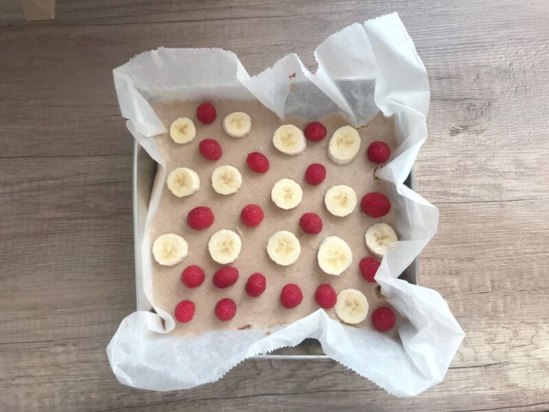 - Na masę bananową układamy plasterki pokrojonego banana i świeże maliny. Możemy użyć także innych owoców: świeżych truskawek, borówek, brzoskwiń.