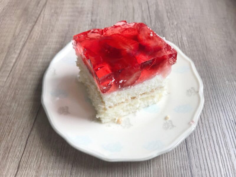 kcalBiszkopt z kremem i truskawkami ukrytymi w truskawkowej galaretce. Pyszne ciasto idealne do przyrządzenia w sezonie na świeże truskawki.