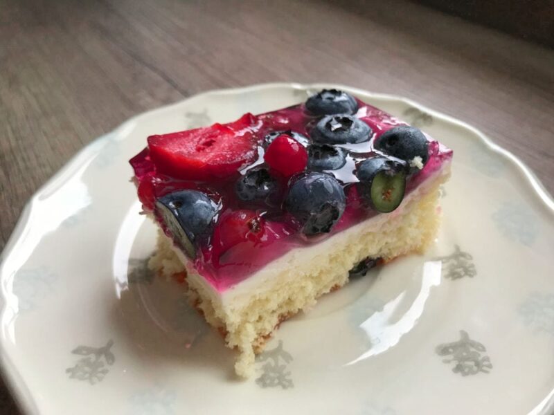kcalMiękki biszkopt z dodatkiem mąki migdałowej, krem śmietankowy i galaretka leśna z owocami lata. Urocze i pyszne ciasto z owocami.