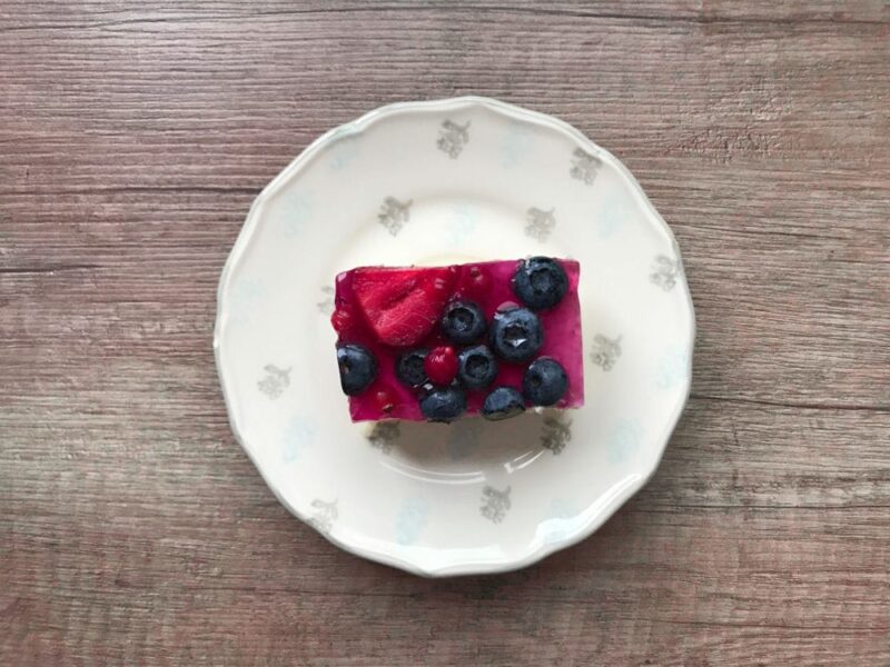 Galaretka z zatopionymi owocami na cieście wygląda jak kulinarne dzieło sztuki
