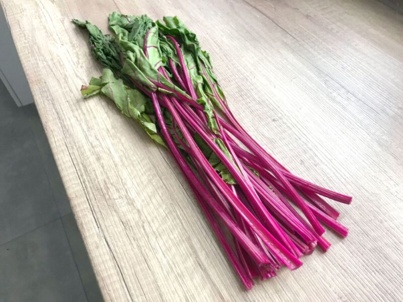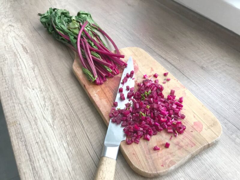 • Łodyżki botwinki opłukaj w wodzie z brudu i ziemi, po czym pokrój drobno (listki mojej botwinki były nie najświeższe, więc usunęłam je). Buraczki z botwinki obierz cienko ze skóry i pokrój w równą kostkę. Cząstki łodyg botwinki i buraczka zalej czystą wodą i chłodnym bulionem. Gotuj przez 10 – 15 minut, dopraw do smaku 1 łyżką cukru, a następnie pozostaw do całkowitego ostygnięcia.