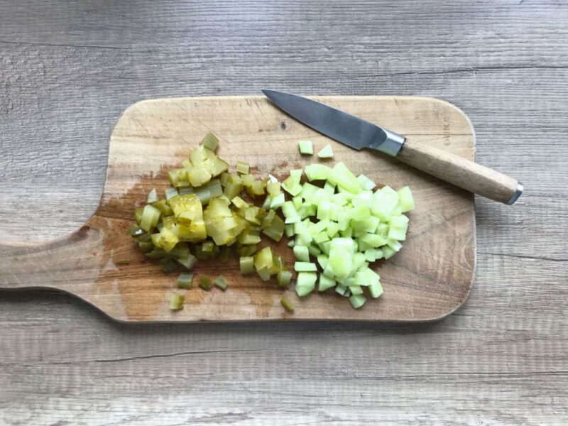• Ogórki pokrój w drobną kostkę, czosnek przeciśnij przez praskę, koperek poszatkuj. Posiekane składniki przełóż do dużego garnka.