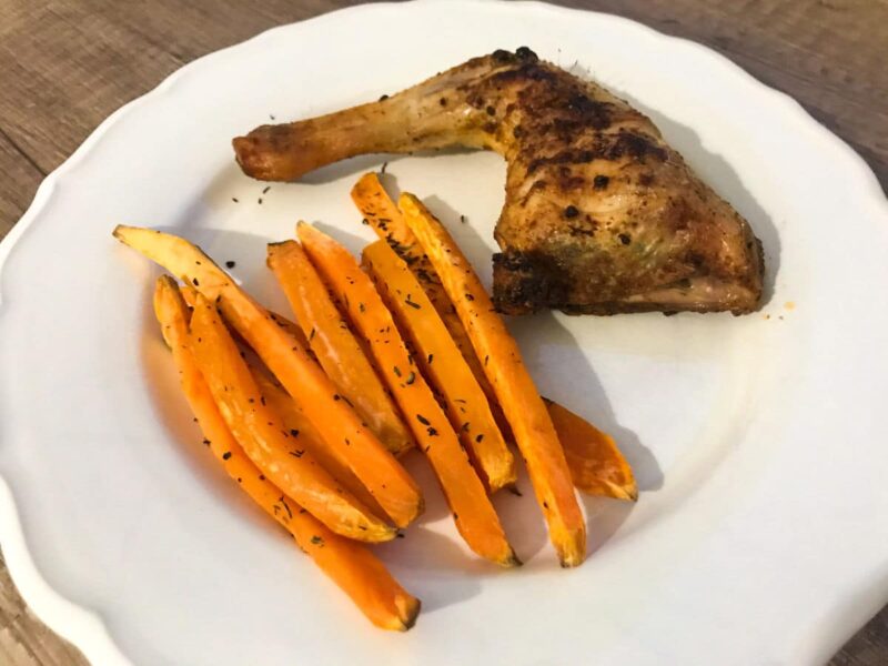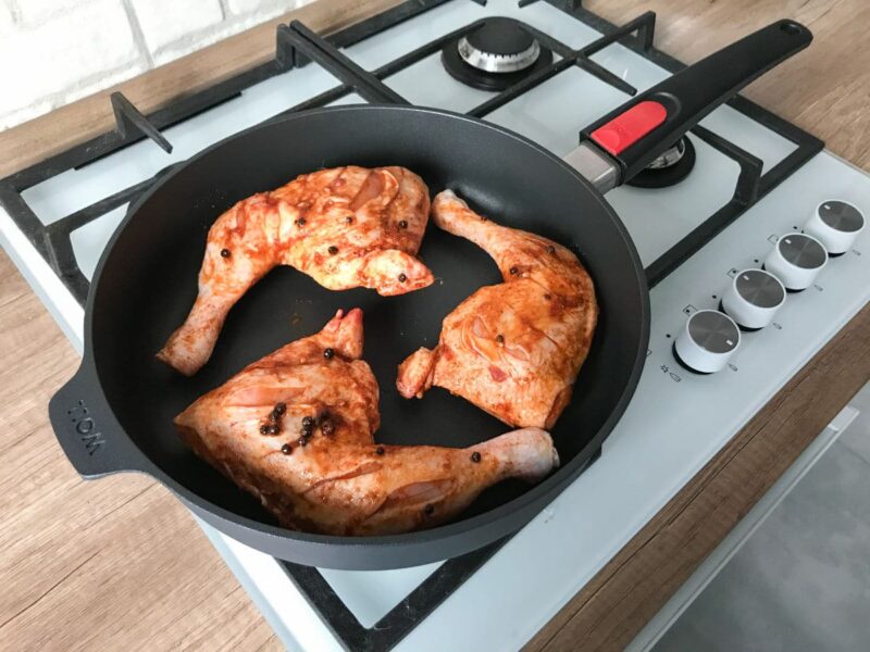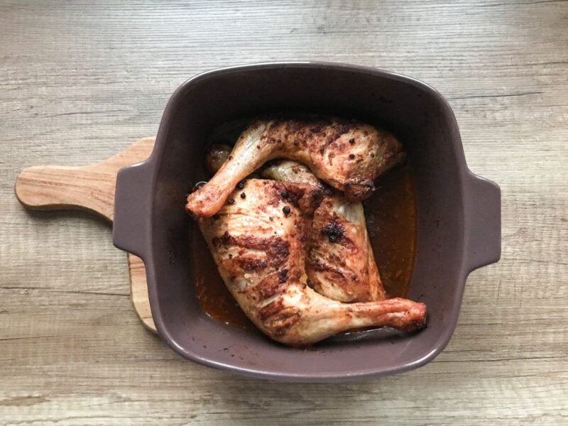 Ćwiartki kurczaka najpierw podsmażone na mocno rozgrzanej patelni dla zamknięcia soków, następnie pieczone w piekarniku. Po upieczeniu mięso jest soczyste, a złocista skórka chrupiąca i przyjemnie przypieczona.
