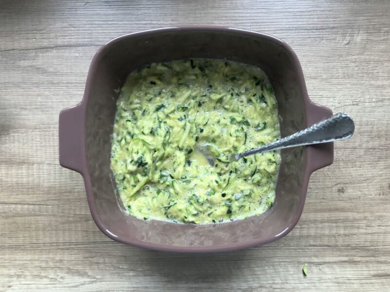 - Cukinie wraz ze skórką zetrzeć na tarce o oczkach średniej wielkości. Zasypać 1/2 łyżeczką soli morskiej i odstawić na 10 minut. Po tym czasie ugnieść ręką i odcedzić nadmiar wody, którą cukinia wydzieliła.