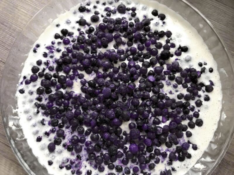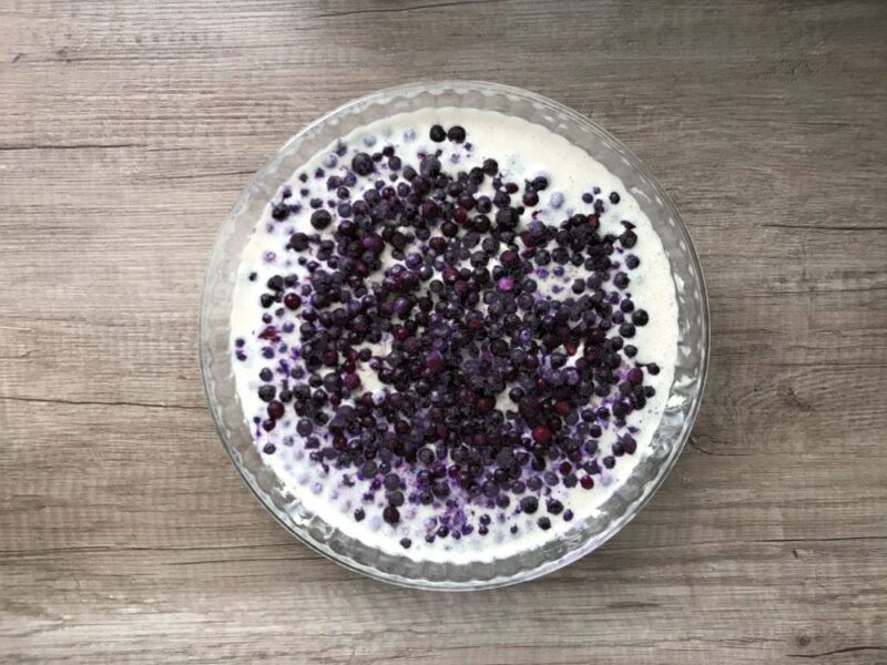 - Przelewamy do naczynia żaroodpornego i wsypujemy umyte i osuszone jagody leśne. Delikatnie możemy całość zamieszać w formie, by jagody równomiernie się rozmieściły.