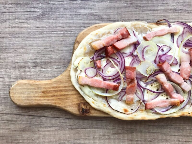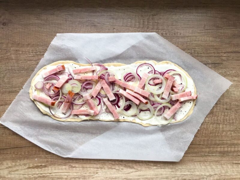 Tarte flambée przypomina nieco pizzę na cienkim i chrupiącym cieście. Mnie osobiście kojarzy się z włoską pizzą i śmietanową carbonarą, której nie śmiem nazwać włoską (raczej polską wariacją na temat carbonary, Włosi przenigdy nie dodają śmietanki do pasta alla carbonara). Z drugiej strony w cieście nie ma drożdży, stąd też smacznie kojarzy się z wypieczoną piętką chleba lub staropolskimi podpłomykami. Tarta pokryta gęstą, słodką i jednocześnie lekko skwaszoną śmietanką crème fraîche, pieczona krótko w wysokiej temperaturze z piórami cebuli oraz boczkiem pokrojonym w drobne słupki. Rustykalna tarta o nieregularnym, niedbałym wyglądzie. Urok dania ukryty w jego prostocie.