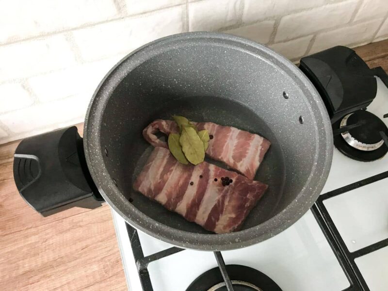 - Do garnka wkładamy żeberka i zalewamy 1,5 litra zimnej wody. Dodajemy 3 kulki ziela angielskiego i 3 liście laurowe. Gotujemy około 30 minut na niewielkim ogniu.