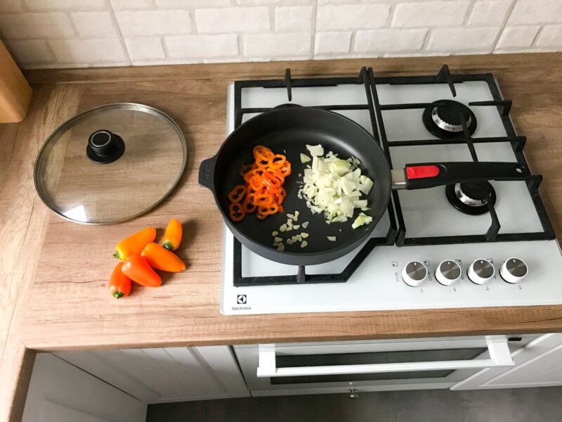 • Cebulkę poszatkuj w drobną kostkę, czosnek i pomarańczową paprykę pokrój w cienkie plasterki. Zeszklij je na tytanowej, nieprzywierającej patelni z oliwą kilka minut, uważając by nie przypaliły się.