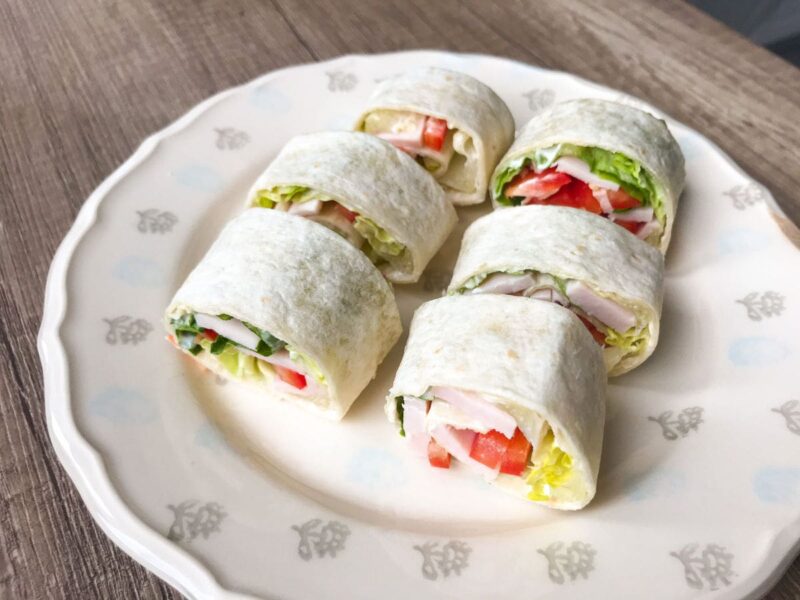 - Ułóż na dekoracyjnym półmisku. Do czasu podania przechowuj owinięte przezroczystą folią spożywczą dzięki której brzegi tortilli nie wyschną i zachowają świeżość.