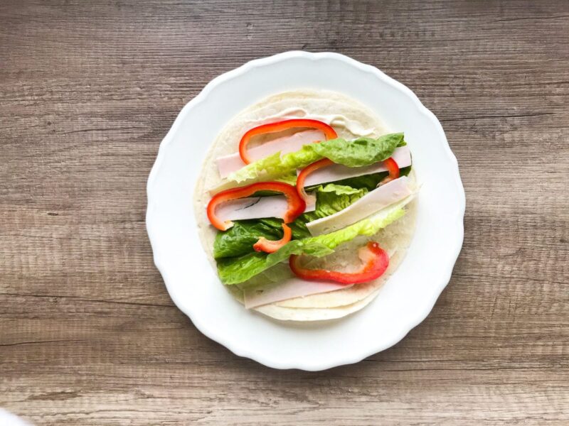 - Na całej powierzchni placków rozłóż liście sałaty lodowej oraz plastry szynki z indyka. Paprykę pokrój w cienkie paseczki i ułóż na plackach.
