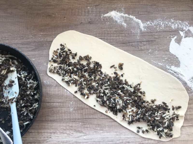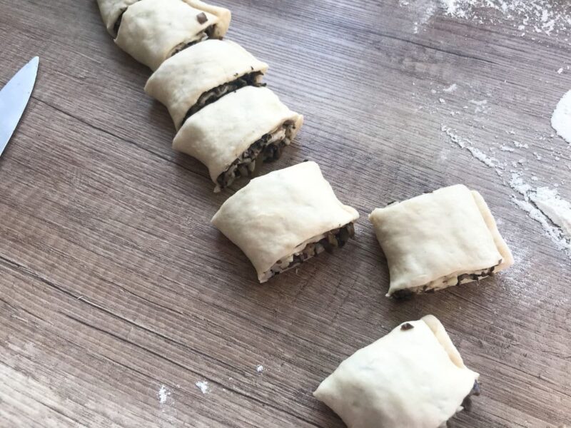 - Po wyrośnięciu ciasta drożdżowego, każdą z 4 części rozwałkuj cienko na kształt prostokąta. Nałóż farsz przygotowany według powyższej instrukcji i zwiń w rulon. Pokrój na 3 – centymetrowe odcinki.