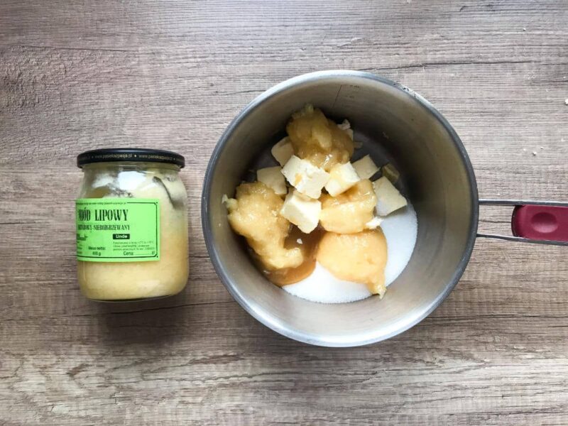 • Masło pokrojone w kostkę, cukier i miód przełóż do rondelka, podgrzewaj mieszając doprowadź do wrzenia i rozpuszczenia kryształków cukru. Miodowy syrop zdejmij z palnika i odstaw do wystudzenia.