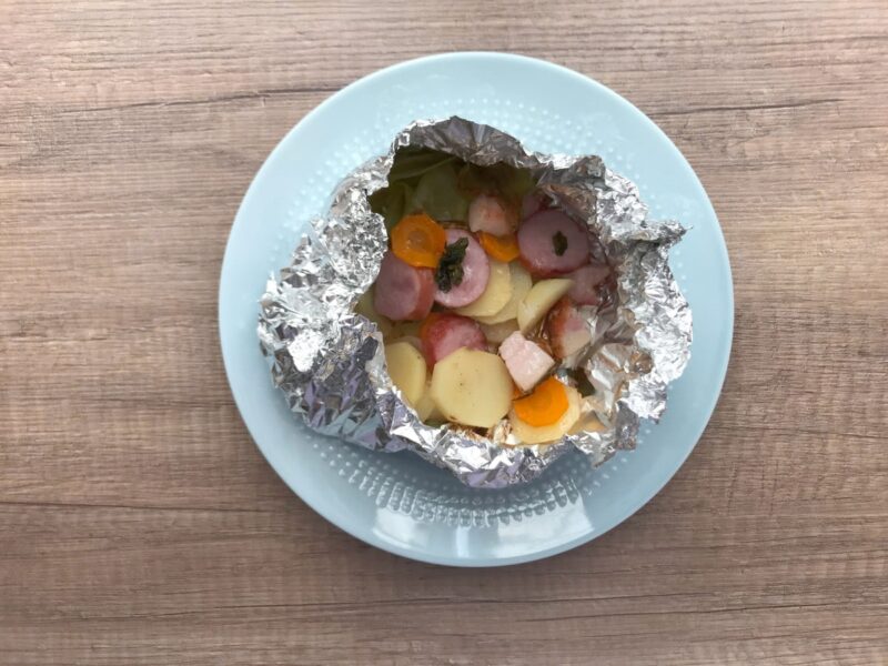 Prażone ziemniaki pieczone w sreberku. Ziemniaczki z marchewką, boczkiem i kiełbasą z grilla lub piekarnika. Potrawa regionalna.