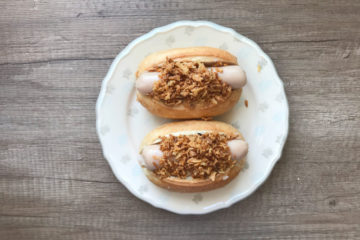 Pomysł na domowe hot dogi śniadaniowe z wykorzystaniem tradycyjnych bułek pszennych, kapusty kiszonej, parówki i prażonej cebulki.