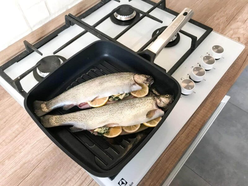 Kolejną przydatną, wręcz niezbędną podczas smażenia ryby kwestią, okazuje się być patelnia. Konieczną właściwością odpowiedniej patelni jest jest nieprzywieralność oraz szybkość nagrzewania i utrzymywanie stałego poziomu ciepła równomiernie na całej powierzchni. Większość spośród dobrych jakościowo patelni posiada wszystkie z wyżej wymienionych cech. Czym więc wyróżnia się patelnia grillowa? Wypustki znajdujące się na dnie patelni pełnią poważniejszą funkcję, niż tworzenie zarumienionych pręgów charakterystycznych dla potraw przyrządzanych na grillu. Mianowicie dania smażone na patelni grillowej opierają się na wypukłych tłoczeniach, zamiast na płaskim dnie topiąc się w oleju. W efekcie zmniejszenia kontaktu z olejem podczas smażenia, mięso, ryby i warzywa pochłaniają mniejszą ilość tłuszczu. Potrawy przygotowane na patelni grillowej okazują się być lżejsze i zdrowsze. Poniżej godna polecenia grillowa patelnia Ambition z serii Taurus.