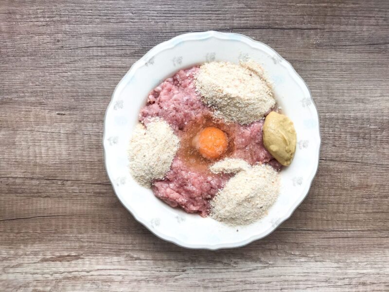 - Mięso mielone zagnieć ręką do uzyskania gładkiej, napowietrzonej struktury. Dodaj jajko, bułkę tartą, musztardę i odrobinę świeżego koperku. Dopraw do smaku solą i pieprzem i wymieszaj.