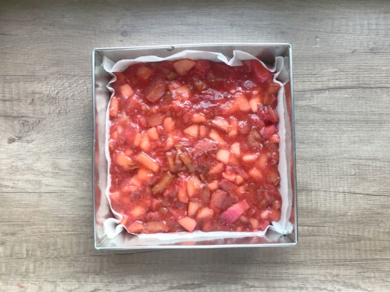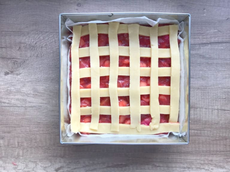 • Kiedy już marmolada z rabarbaru, jabłek i truskawek będzie zimna, a ciasto kruche schłodzone, przejść do kolejnego kroku. Przygotować brytfannę i wyłożyć ją papierem do pieczenia. Moja blaszka ma wymiary 24 x 24 cm. Papier do pieczenia przesmarować odrobiną masła i obsypać bułką tartą, nadmiar bułki strzepnąć. Piekarnik nagrzać do 180 stopni.