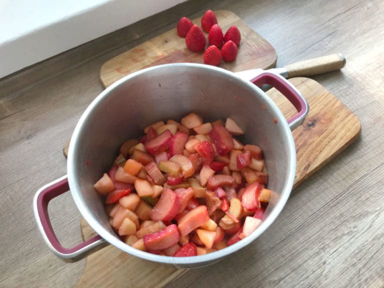 • Rabarbar pokroić na plasterki grubości mniej więcej 1,5 cm. Najlepiej użyć głównie intensywnie czerwonych części rabarbaru, dla uzyskania apetycznego odcienia. Rabarbaru nie trzeba obierać, ponieważ pod wpływem temperatury całkowicie zmięknie. Truskawkom usunąć szypułki i pokroić na mniejsze cząstki. Jabłka obrać ze skórki i pokroić w grubą kostkę.