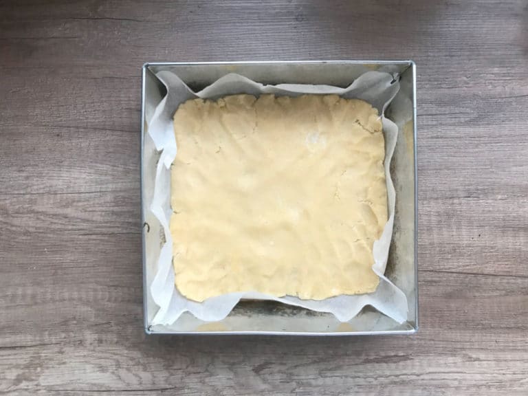 • 1 część kruchego ciasta rozwałkować wałkiem pomiędzy 2 kawałkami przezroczystej folii spożywczej. Najlepiej by uzyskany kształt ciasta, przypominał spód naszej blaszki do pieczenia. Ciasto rozłożyć na dnie brytfanny.