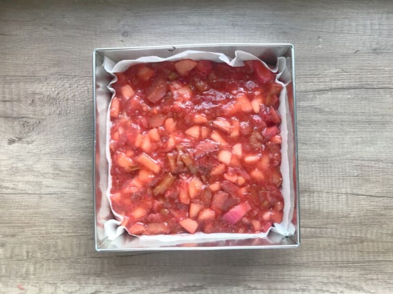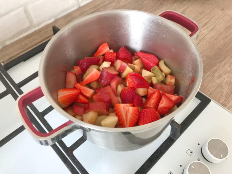 • Rabarbar pokroić na plasterki grubości mniej więcej 1,5 cm. Najlepiej użyć głównie intensywnie czerwonych części rabarbaru, dla uzyskania apetycznego odcienia. Rabarbaru nie trzeba obierać, ponieważ pod wpływem temperatury całkowicie zmięknie. Truskawkom usunąć szypułki i pokroić na mniejsze cząstki. Jabłka obrać ze skórki i pokroić w grubą kostkę.
