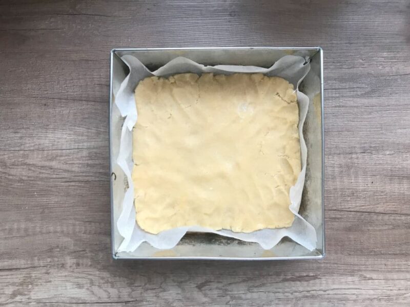 • 1 część kruchego ciasta rozwałkować wałkiem pomiędzy 2 kawałkami przezroczystej folii spożywczej. Najlepiej by uzyskany kształt ciasta, przypominał spód naszej blaszki do pieczenia. Ciasto rozłożyć na dnie brytfanny.