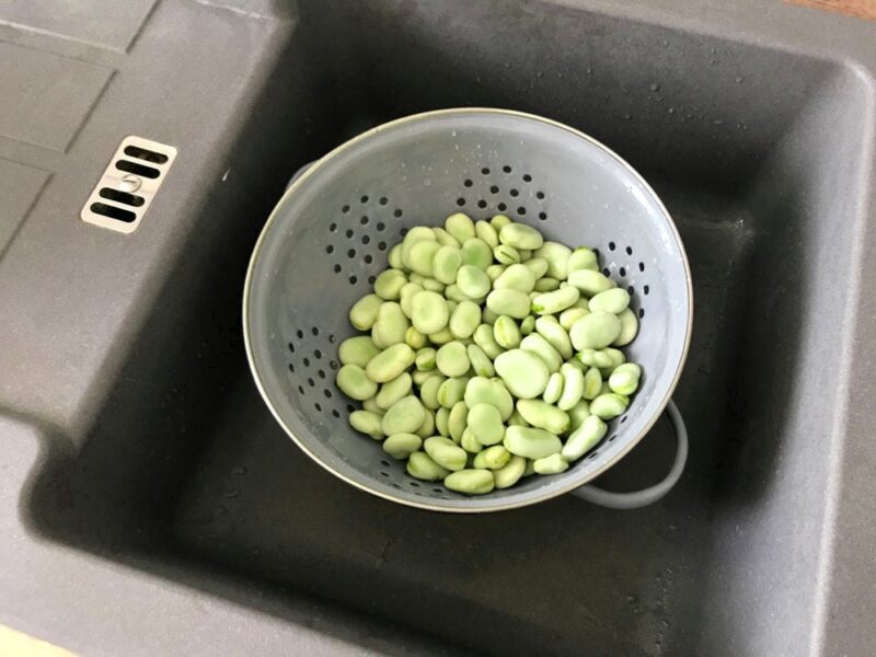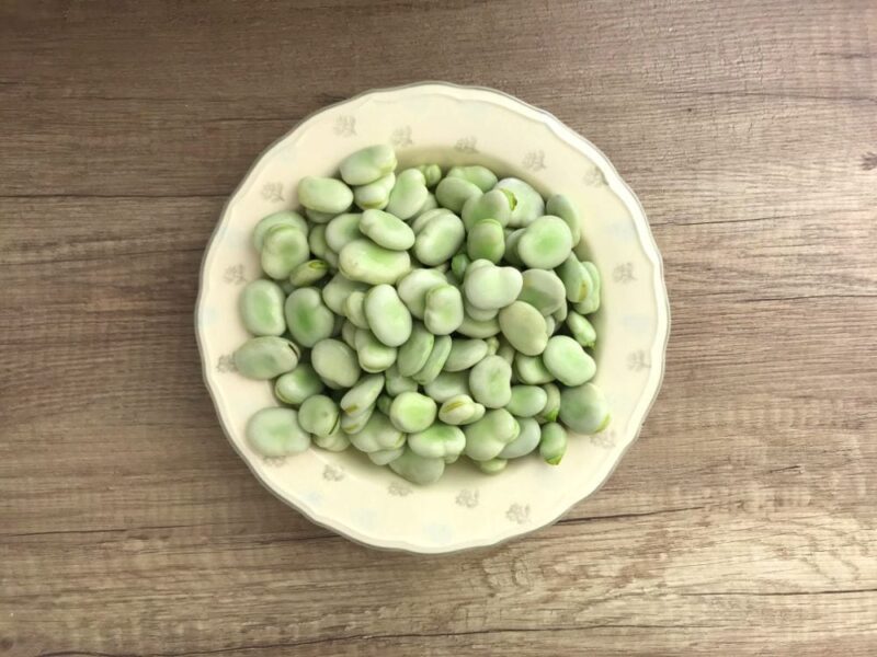 - Umyty bób włożyć do garnka i zalać zimną wodą, ponad poziom bobu. Postawić na palniku z gazem, gdy woda zacznie wrzeć, dodać 1/2 łyżeczki soli. Gotować do miękkości przez 20 minut – po ugotowaniu bób powinien mieć lekko pomarszczoną skórkę. Odcedzić i pozostawić do przestudzenia. Nie jest to konieczne, ale bób można obrać jeśli skórka nam przeszkadza.