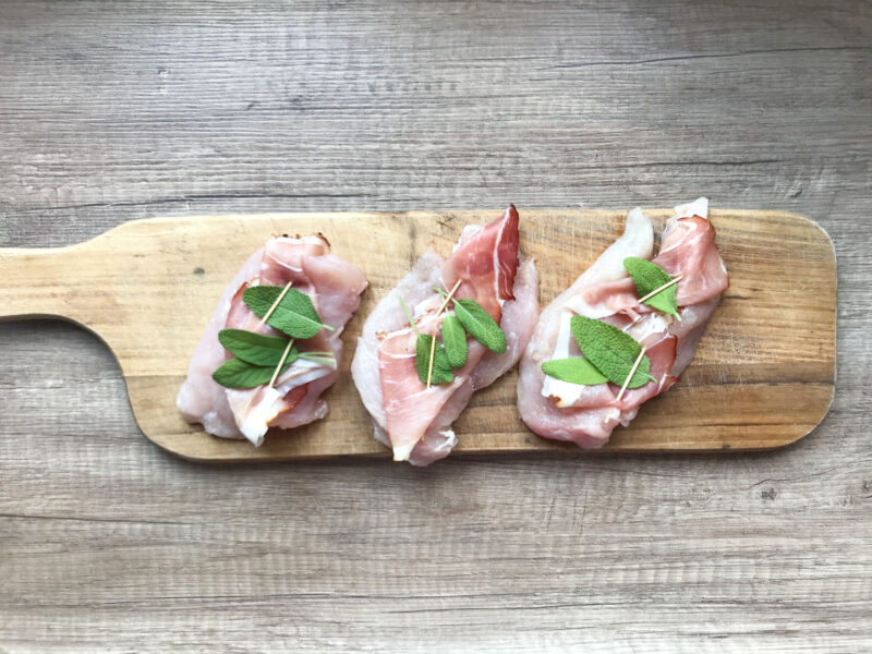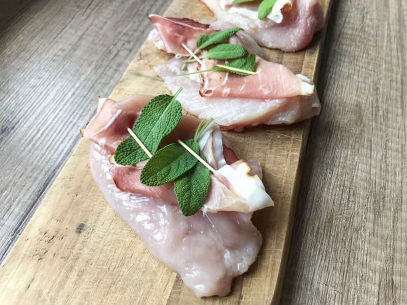 Soczyste płaty piersi kurczaka, okryte plastrami szynki parmeńskiej i świeżej szałwii. Po usmażeniu skropione deglasowanym sosem z patelni, z dodatkiem białego wina. Odrobina włoskiej kuchni w przystępnej, prostej w przygotowaniu wersji.