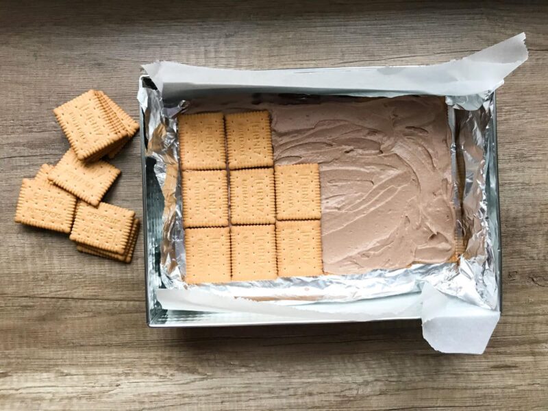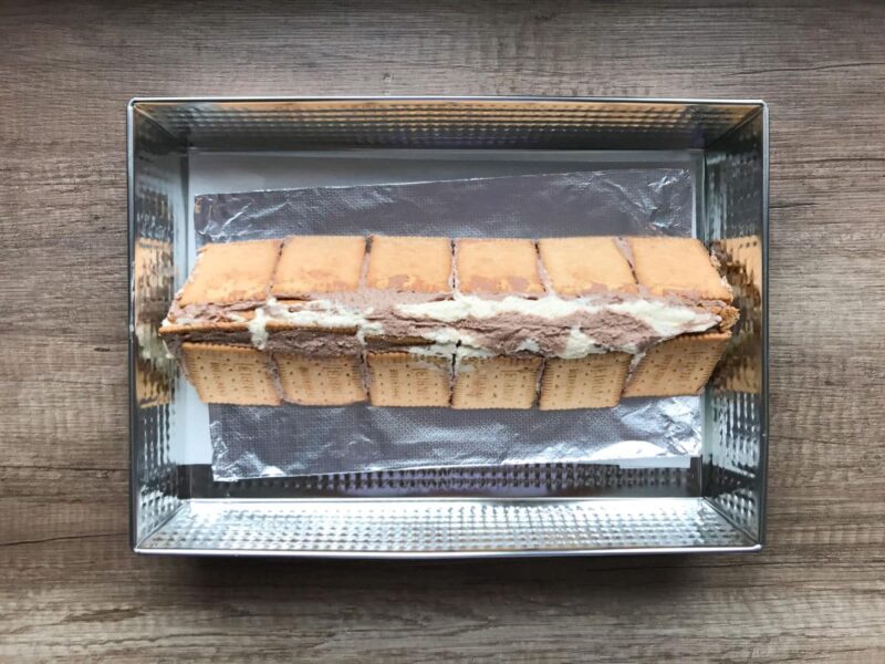 • Na sreberku spożywczym ułóż połowę herbatników. Na nie wyłóż 2/3 twarogowej masy z kakao rozsmarowując po całej powierzchni, na wierzch druga warstwa herbatników.