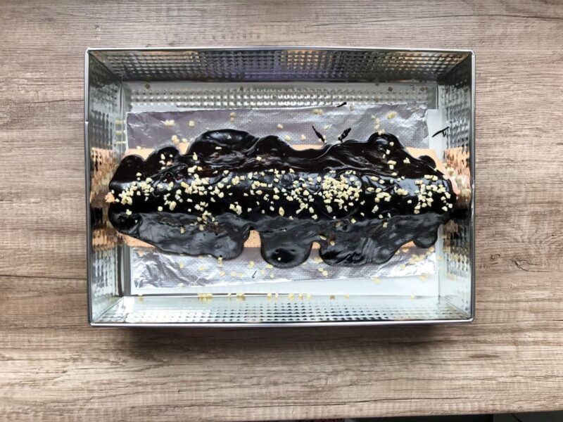 • Następnie wyłóż na herbatniki całą białą masę serową z kawałkami orzechów, rozłóż ją równomiernie po całości dojeżdżając do brzegów. Na środeczku wzdłuż wyłóż pas z reszty ciemnej masy kakaowej.