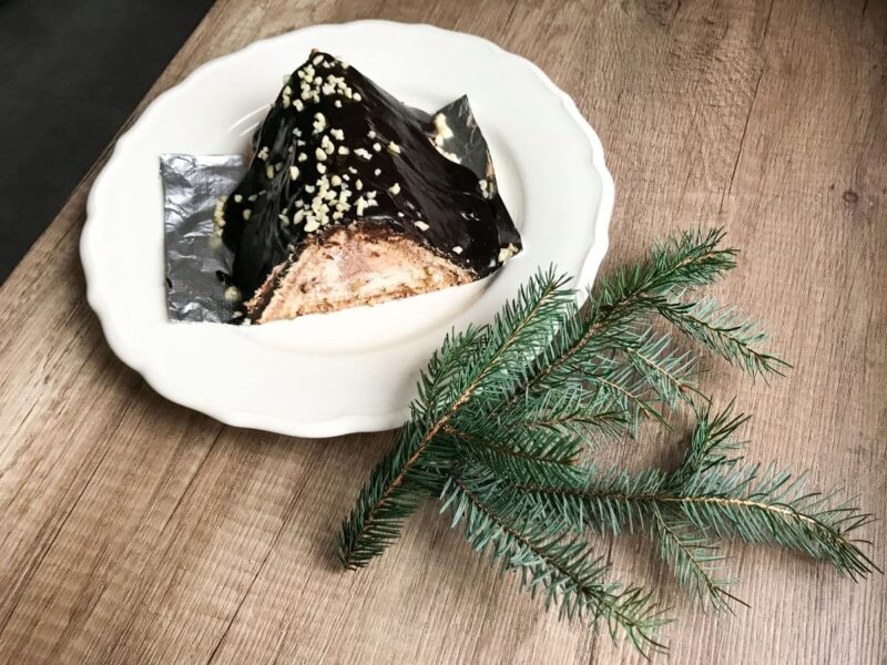Serniczek bez pieczenia z zatopionymi kawałkami orzechów włoskich i herbatnikami. Czarno biała masa serowa uformowana w trójkątny domek Baby Jagi, obficie oblana polewą aksamitną czekoladową z gorzkiego kakao. Kawałki orzechów włoskich miękną od masy serowej, nadając jej przyjemnej struktury.