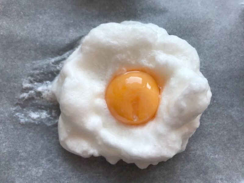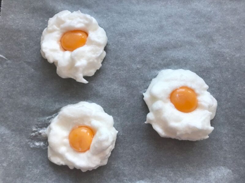 Pomysł na jajka w wyjątkowej postaci. Żółtka zapiekane w puszystej chmurce z białka. Białko przypomina swoją konsystencją napowietrzoną bezę, a żółtko jest półpłynne. Dlatego podsuwam tą propozycję na urozmaicenie śniadania, szczególnie dla dzieci niejadków.