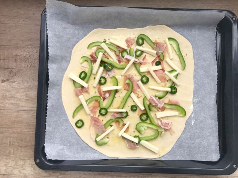 Jalapeno zastąpiłem zwykłą zieloną papryką. Ciasto cienkie a brzegi chrupiące, doskonały przepis.