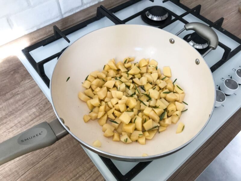 - Ziemniaki obierz i umyj w zimnej wodzie. Pokrój w drobną, równą kostkę o brzegu 1 – centymetra. Gałązki rozmarynu podziel na krótsze kawałki.
